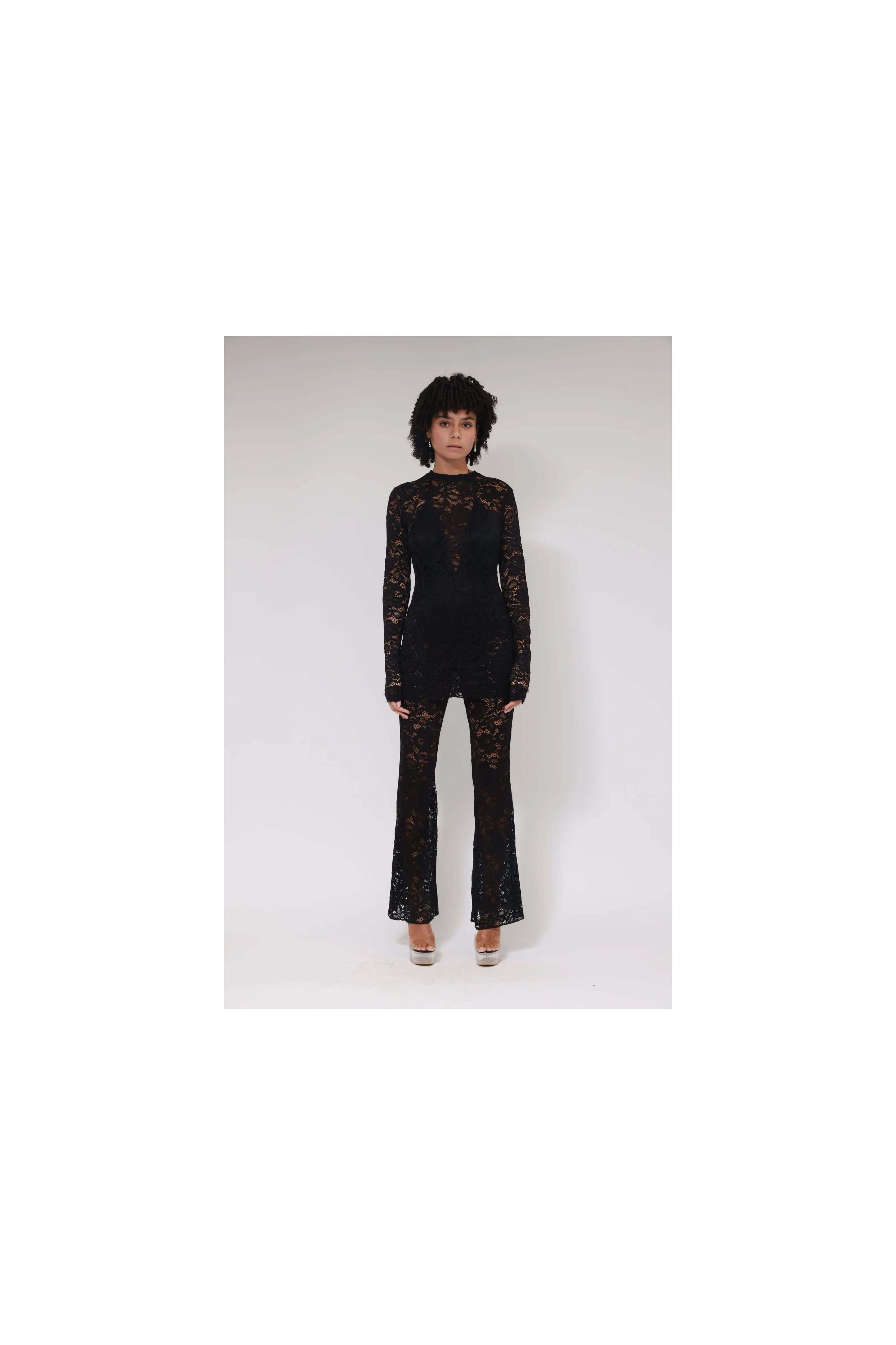 This long-sleeved lace T-shirt combines refinement and comfort. Its fine texture and delicate details highlight your natural elegance, perfect for adding a sophisticated touch to any outfit, from everyday wear to special occasions.