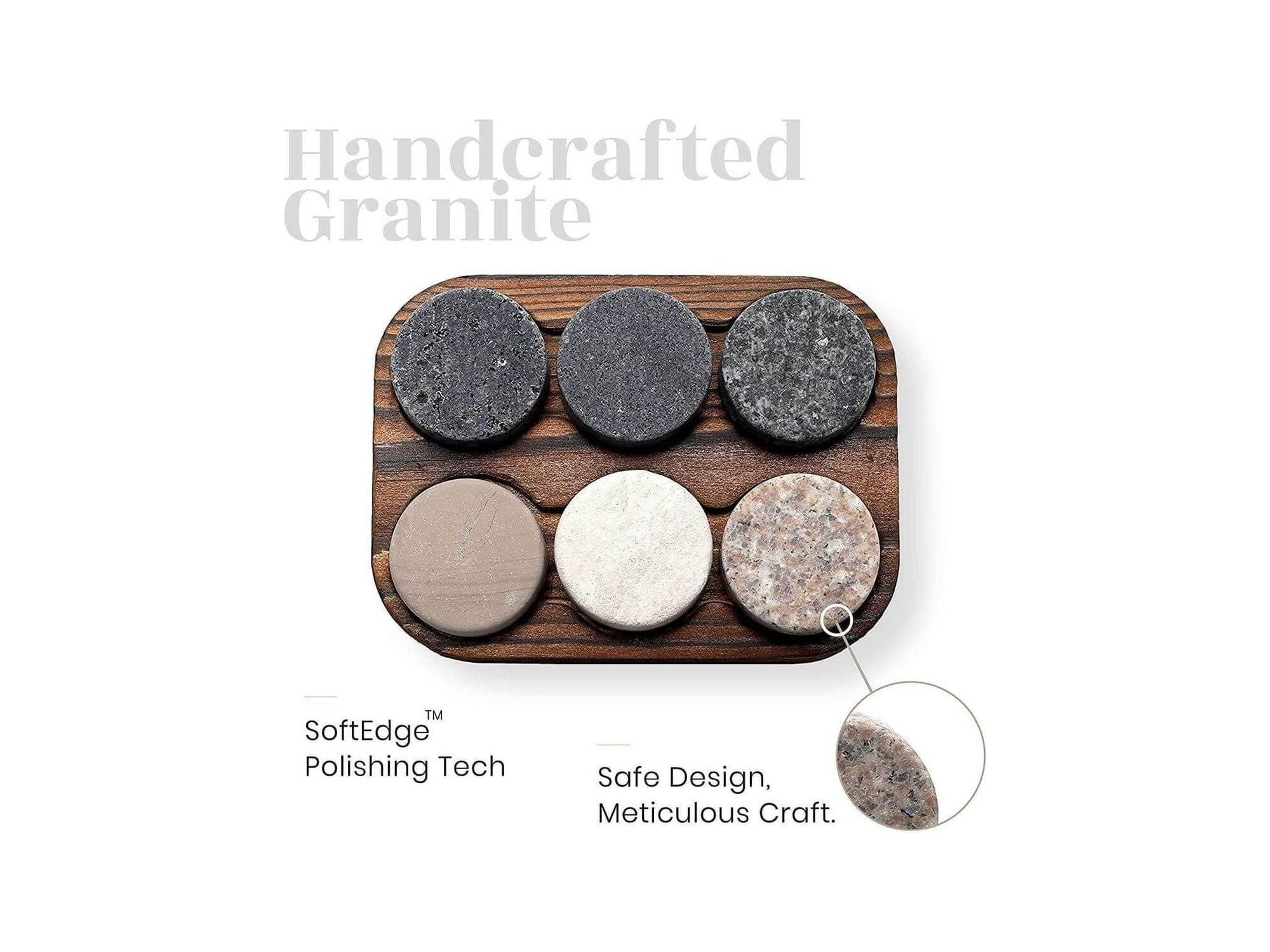 Discover these fast-chilling, non-diluting, round solid granite stones used to perfectly chill fine spirits without diluting your drink. Each of our 6 whiskey stones has a different granite color and style, making each set unique and beautifully distinctive. Enhance your drinking experience or treat a loved one with our best-selling set.
