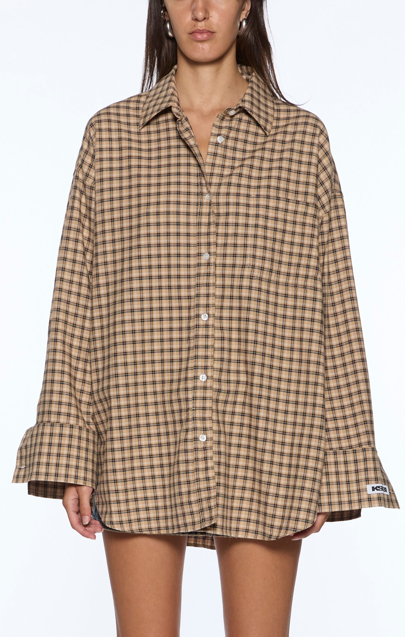 Oversized button-up shirt, made from premium European 100% Organic Cotton in a tan plaid colourway. Featuring a patch pocket, curved hem, classic center front collar and exaggerated cuffs. Finished with a 'SOTT' woven label on cuff and Ksubi T-box embroidery. Style back with any Ksubi denim for an off-duty elevated look.