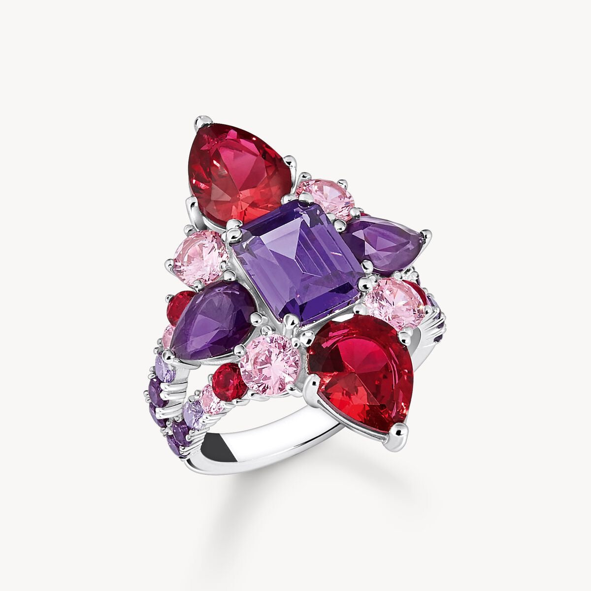 Bague cocktail en argent sterling 925 recyclé, cette pièce d'exception allie élégance intemporelle et éclat spectaculaire. Son design raffiné met en scène une pierre violette octogonale centrale, sublimée par un halo de pierres multicolores—roses, rouges et violettes—en tailles et formes variées. Le serti à griffes ouvert amplifie le jeu de lumière, créant des reflets intenses et captivants. Les épaulettes ornées de petites pierres ajoutent une dimension ouvragée, tandis que la bande légèrement arrondie assure un port confortable et élégant. Une signature de luxe minimaliste qui se marie harmonieusement avec d'autres créations de la collection.