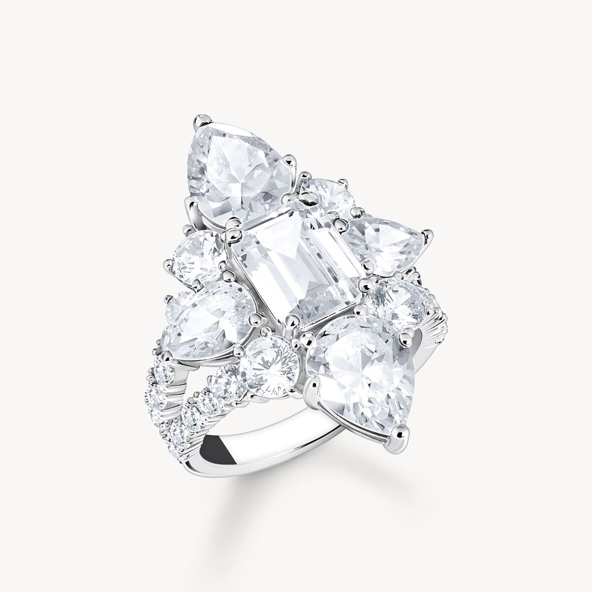 Bague cocktail en argent sterling 925 recyclé, cette pièce d'exception allie élégance intemporelle et brillance captivante. Son design sophistiqué conjugue un zircon blanc octogonal central, entouré de pierres de formes variées—rondes, gouttes et facettées—créant un jeu de lumière intense et hypnotisant. Le serti à griffes ouvert amplifie l'éclat de chaque pierre, tandis que la bande légèrement bombée épouse parfaitement votre doigt pour un port sans effort. Matière noble et durable, cette bague incarne le luxe responsable. À porter seule pour un impact maximal ou en harmonie avec d'autres pièces de la collection pour une allure véritablement glamour.