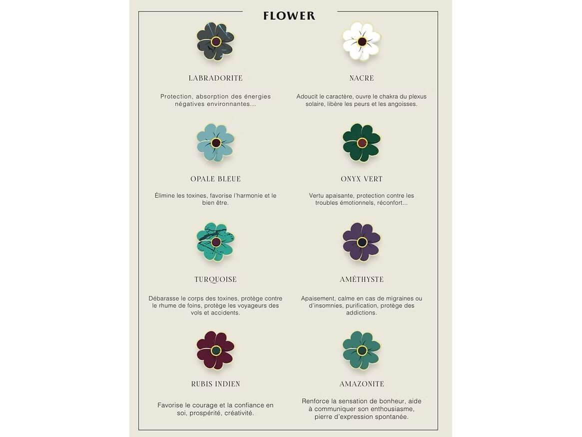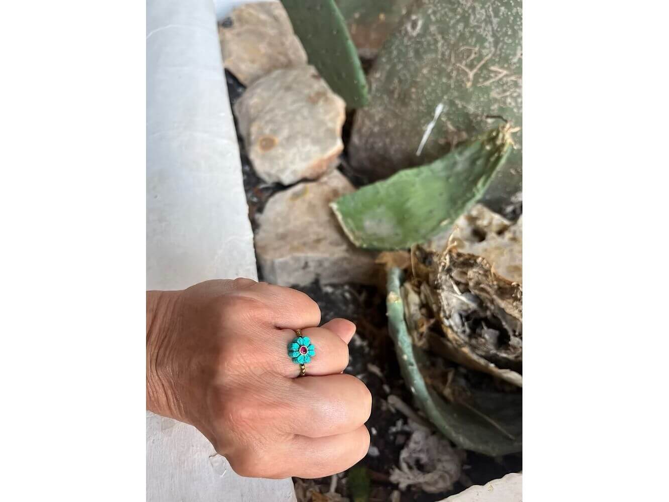 Bague Mini Flower : élégance minimaliste et intention spirituelle. Montée sur un fil élastique invisible, elle épouse parfaitement votre doigt et se porte en solo ou superposée. Les perles dorées en hématite captent subtilement la lumière, tandis que la fleur en turquoise—pierre de sérénité et de protection—ajoute une touche de couleur chargée de sens. Chaque variante de fleur correspond à une pierre semi-précieuse sélectionnée pour son énergie propre. Un accessoire discret mais significatif, parfait pour celles qui cherchent beauté et intention dans leurs bijoux.