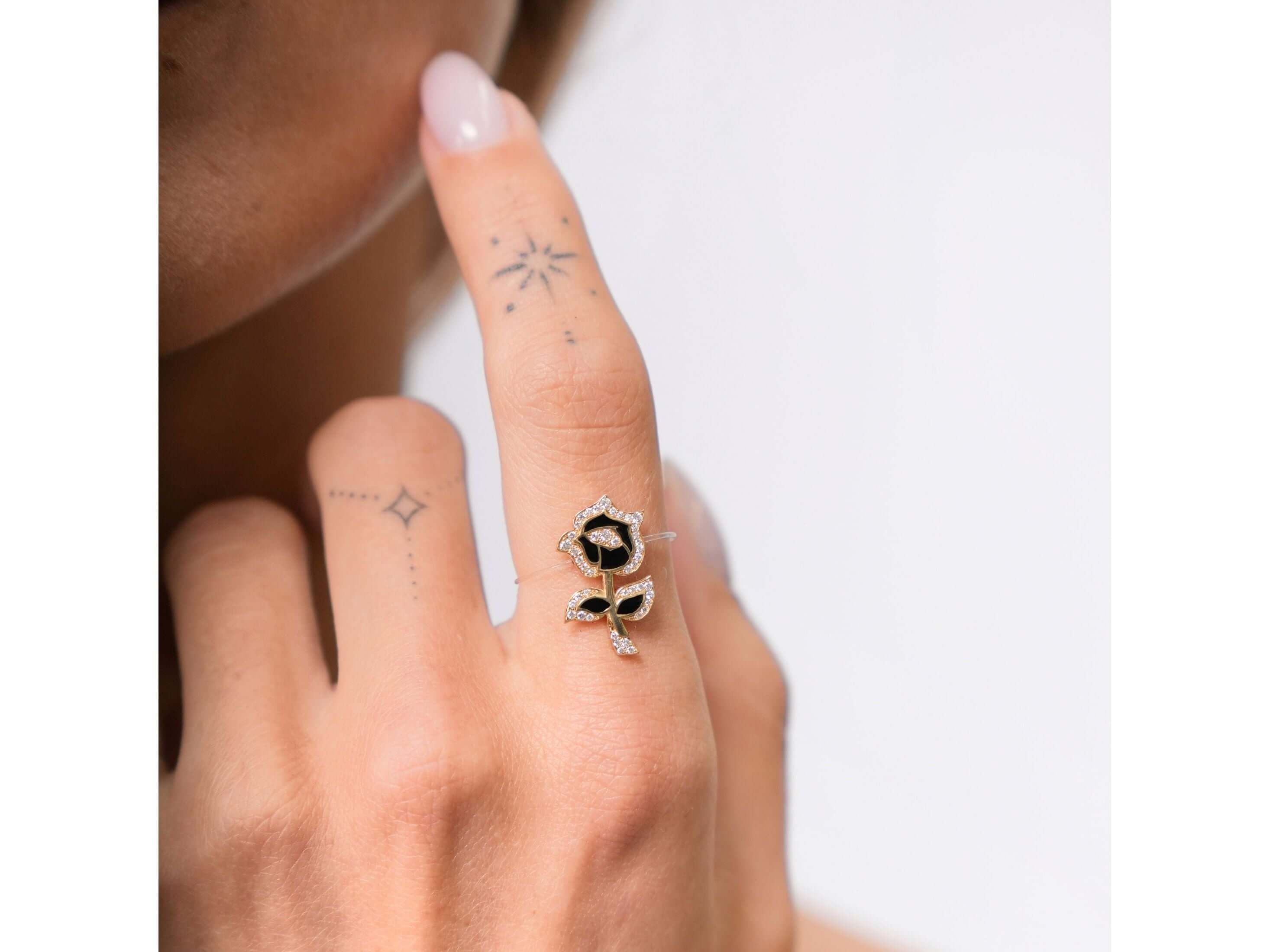 L’or jaune 18 carats se pare d’une laque noire intense, tandis que des diamants de laboratoire, tels des étoiles, illuminent ce bijou mystique. Un fil de nylon invisible, léger et subtil, enlace la fleur, créant une aura magique et sophistiquée.