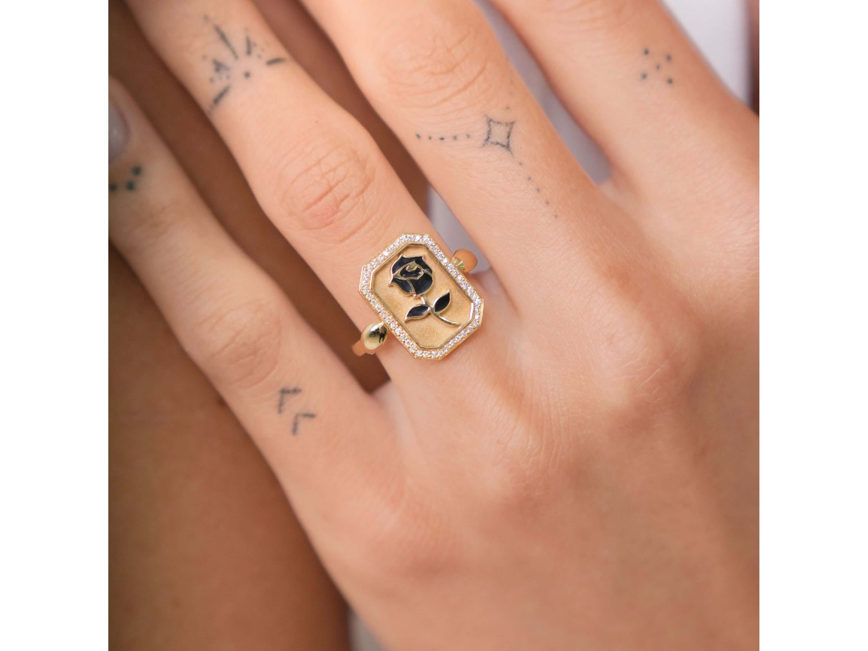 Fabriquée en or jaune 18 carats, cette bague diffuse une chaleur intemporelle et une présence majestueuse. La brillance de l'or sublime la profondeur mystérieuse de la rose noire, créant une harmonie parfaite entre l'authenticité et la passion.