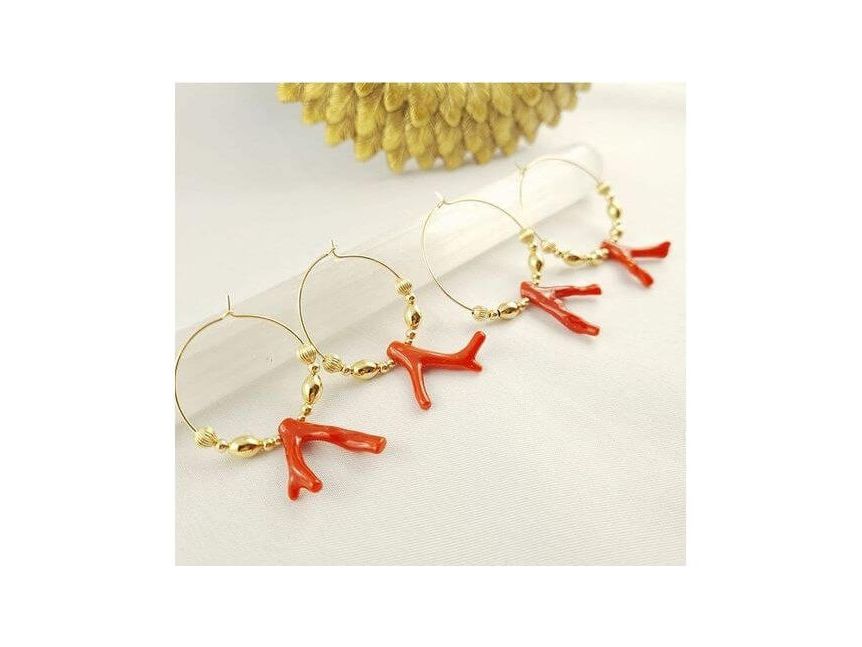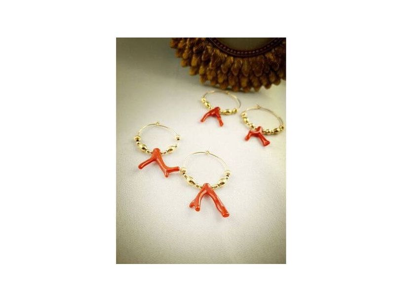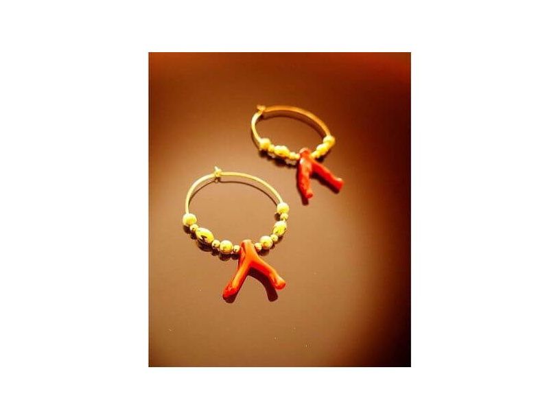 Créoles en plaqué or gold filled 14 carats ornées de perles également en gold filled et de branches de corail rouge de Méditerranée.