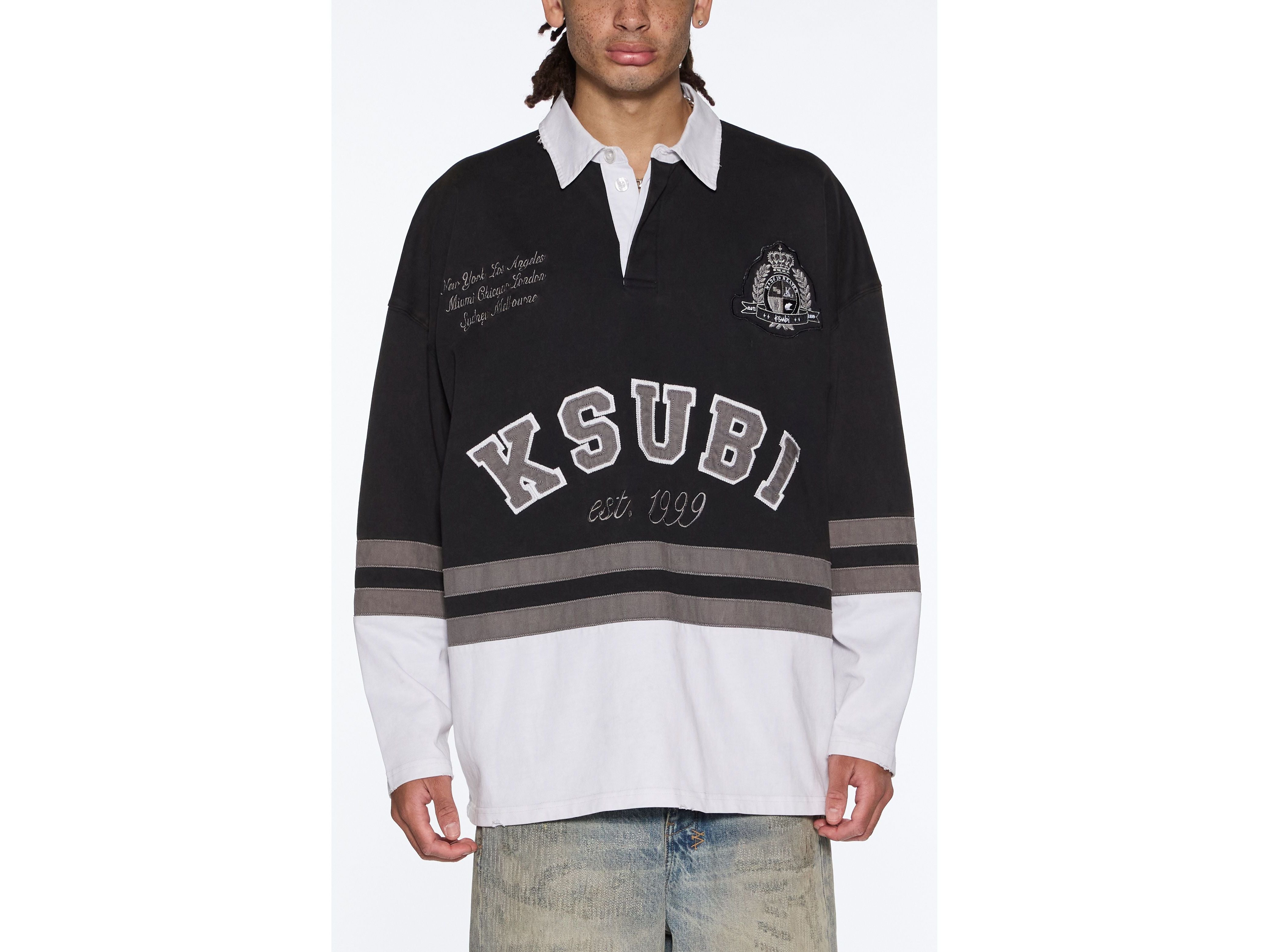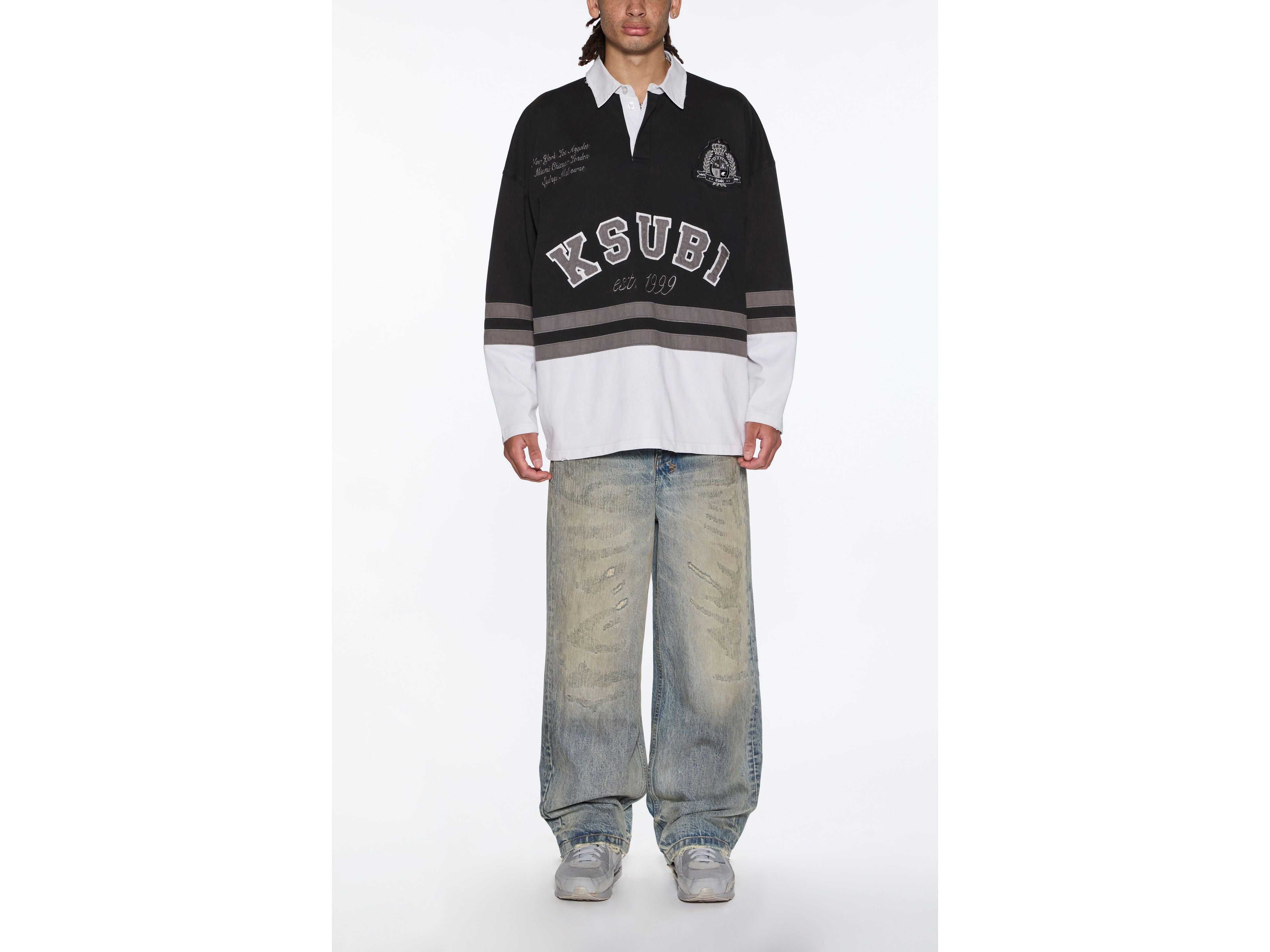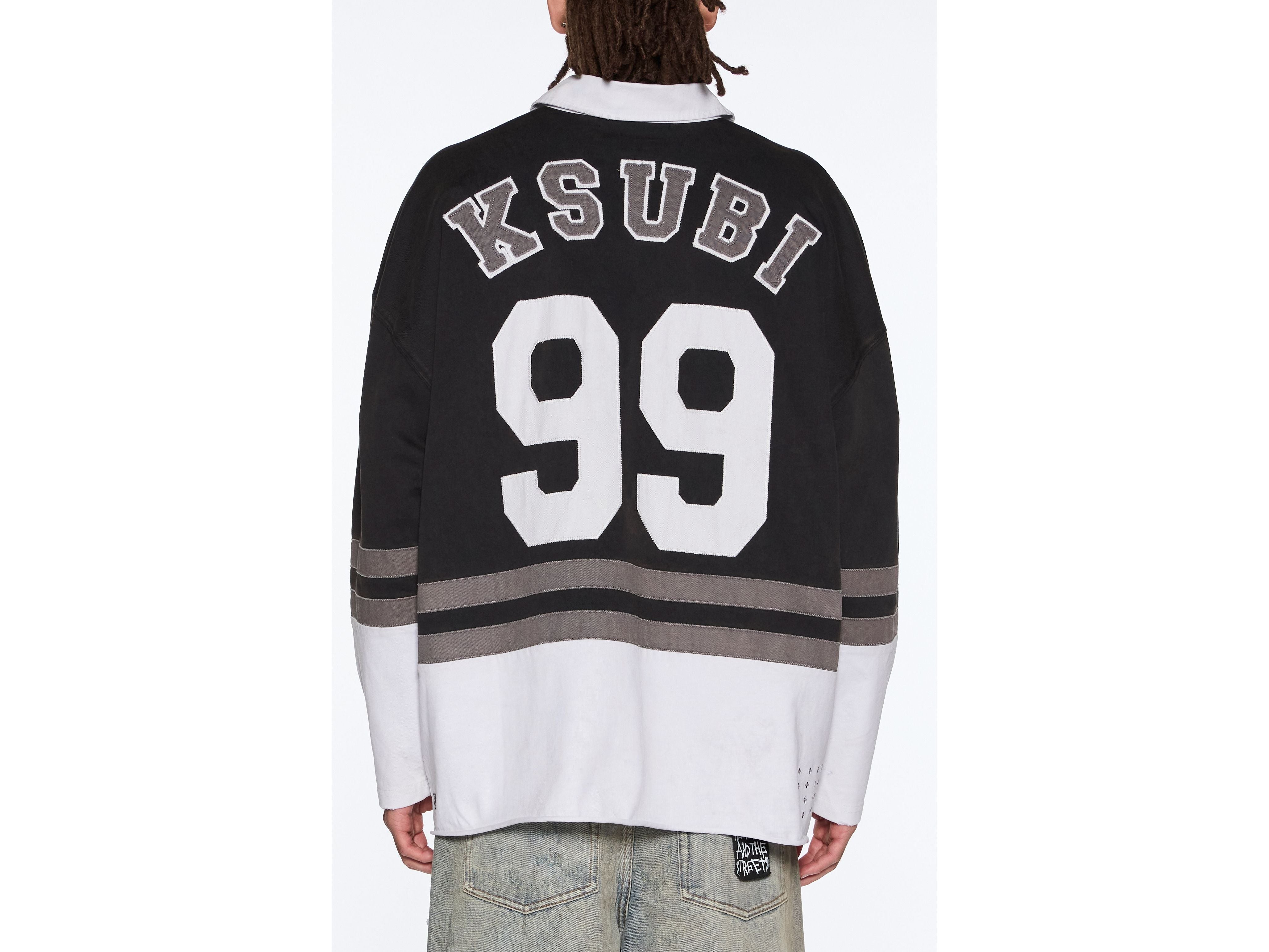 Oversized fit, long sleeve rugby jersey with a quarter neck button placket and a cotton twill collar. Cut from a heavyweight rugby jersey in black and white. Detailes include applique design lines, multi-textural artworks on the front and back. Finished with a signature t-box and 4x4 branding and Ksubi branded hardware. SAMPLE NOTE: Will not have any seam grinding. Less washed.
