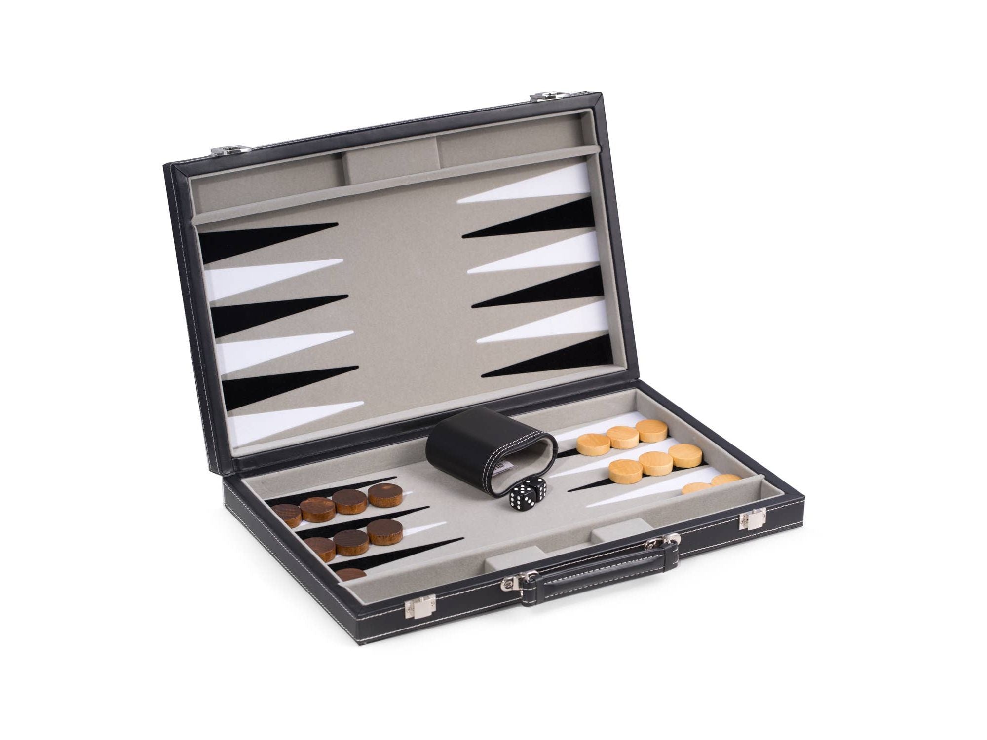 Ensemble de backgammon en similicuir noir 15" avec accents chromés. Pièces de jeu en bois. Bonnets dés en cuir. Doublure en feutre lisse.