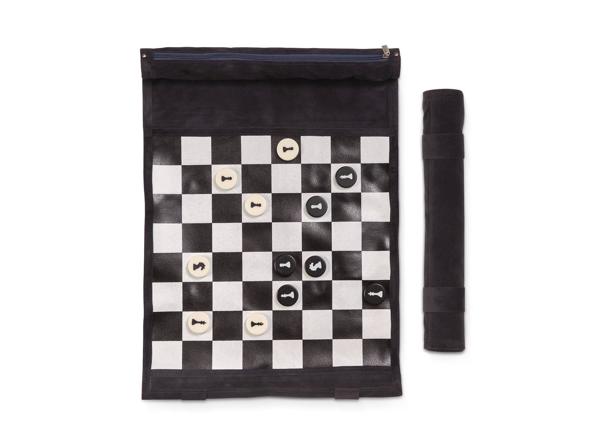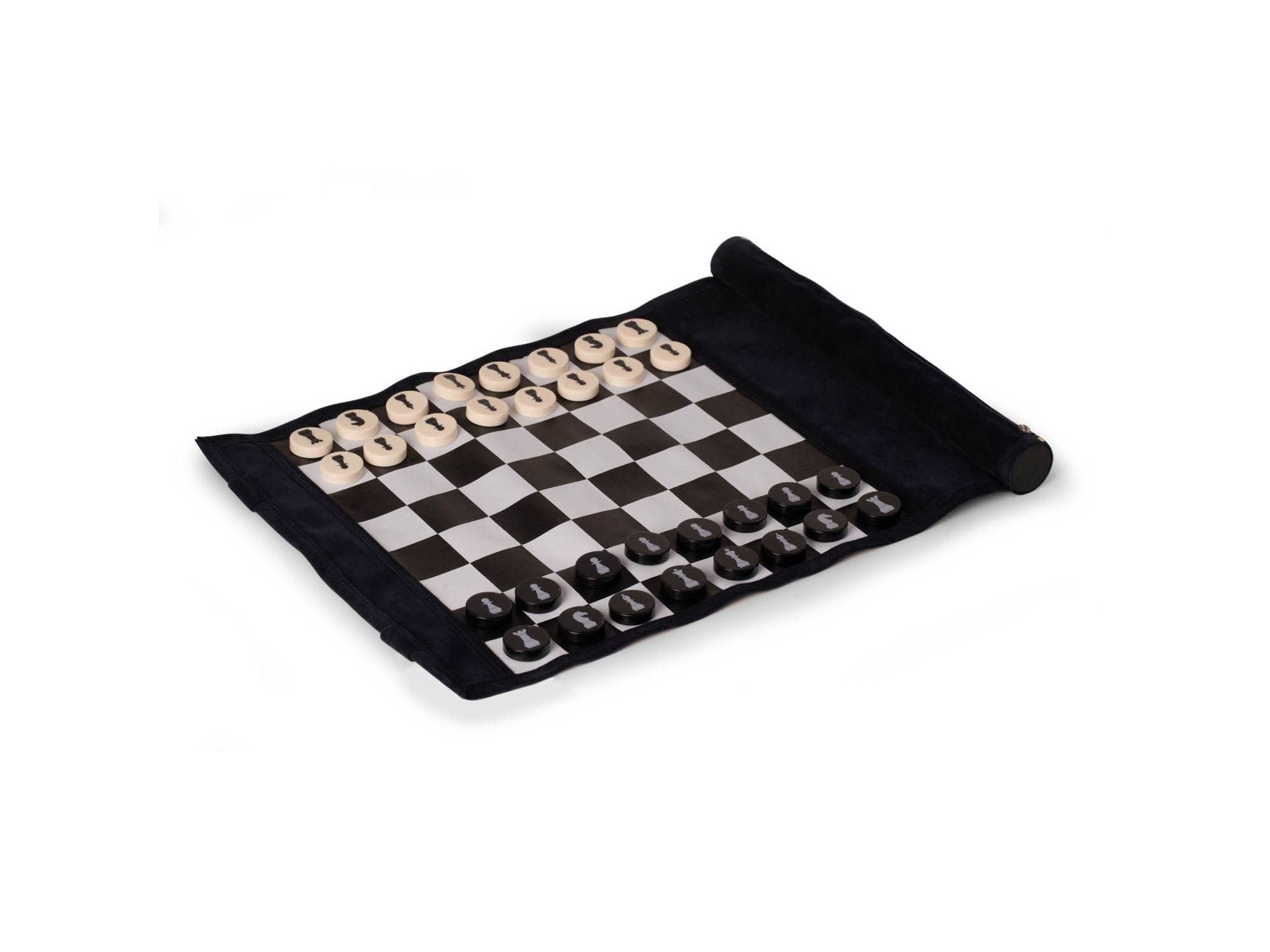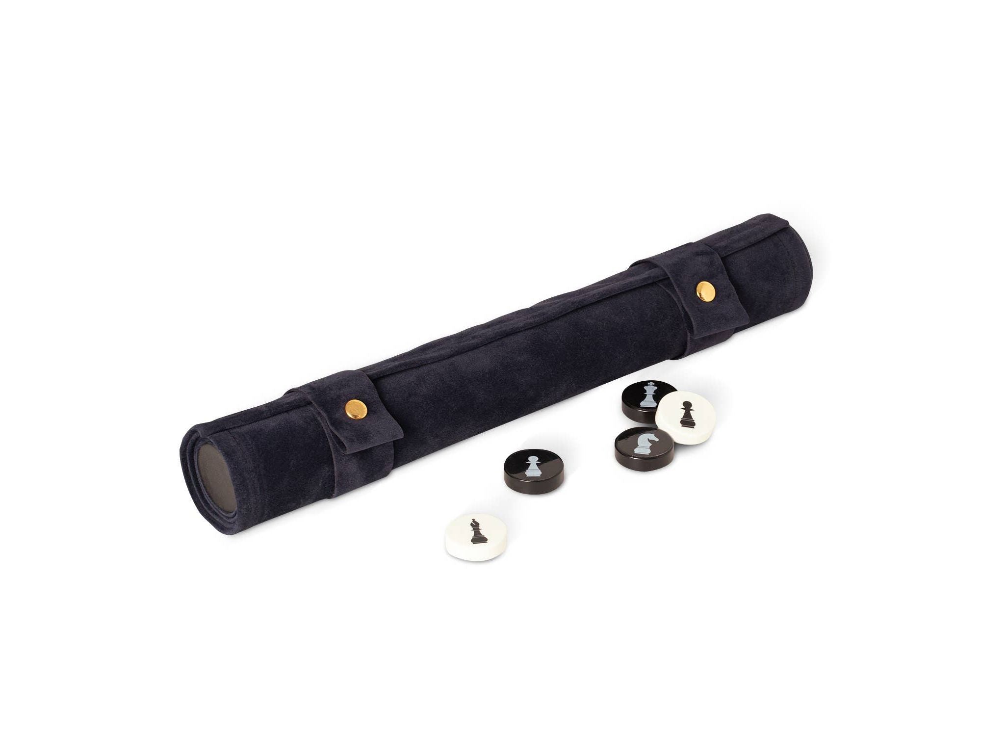 Pour les amateurs de jeu en déplacement, cet ensemble d'échecs de voyage enroulable avec double fermeture à pression et un compartiment discret zippé qui stocke vos 32 pièces d'échecs. Le plateau de jeu doux en daim bleu marine est accentué de carrés noirs et blancs pour faire une planche de jeu parfaite. Maintenant, vous pouvez profiter d'une version portable d'un jeu de société populaire tout en voyageant, lors d'un pique-nique ou dans votre bureau. Modèle # G569B.