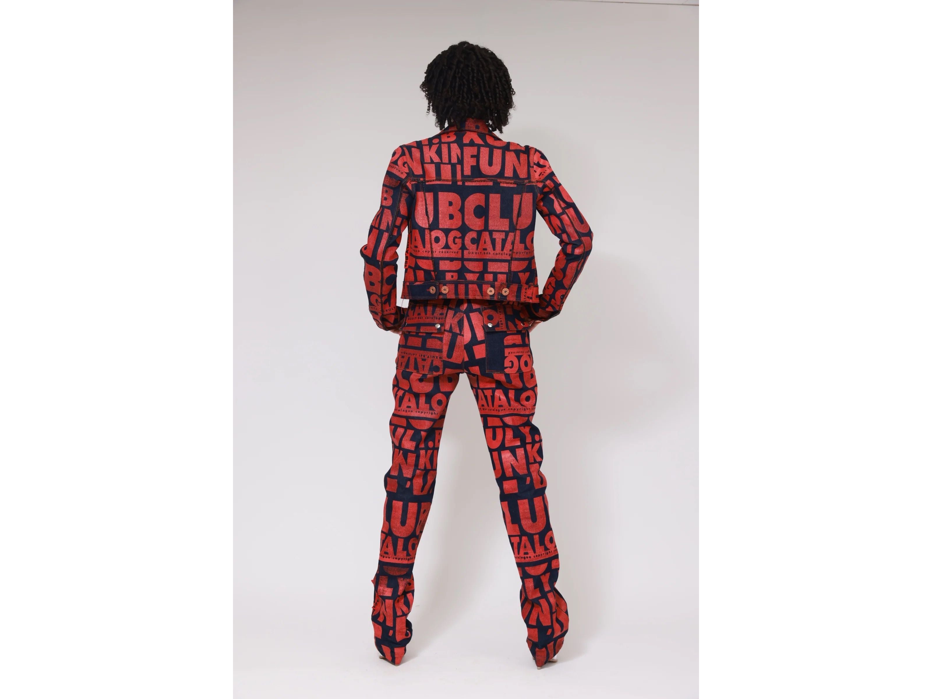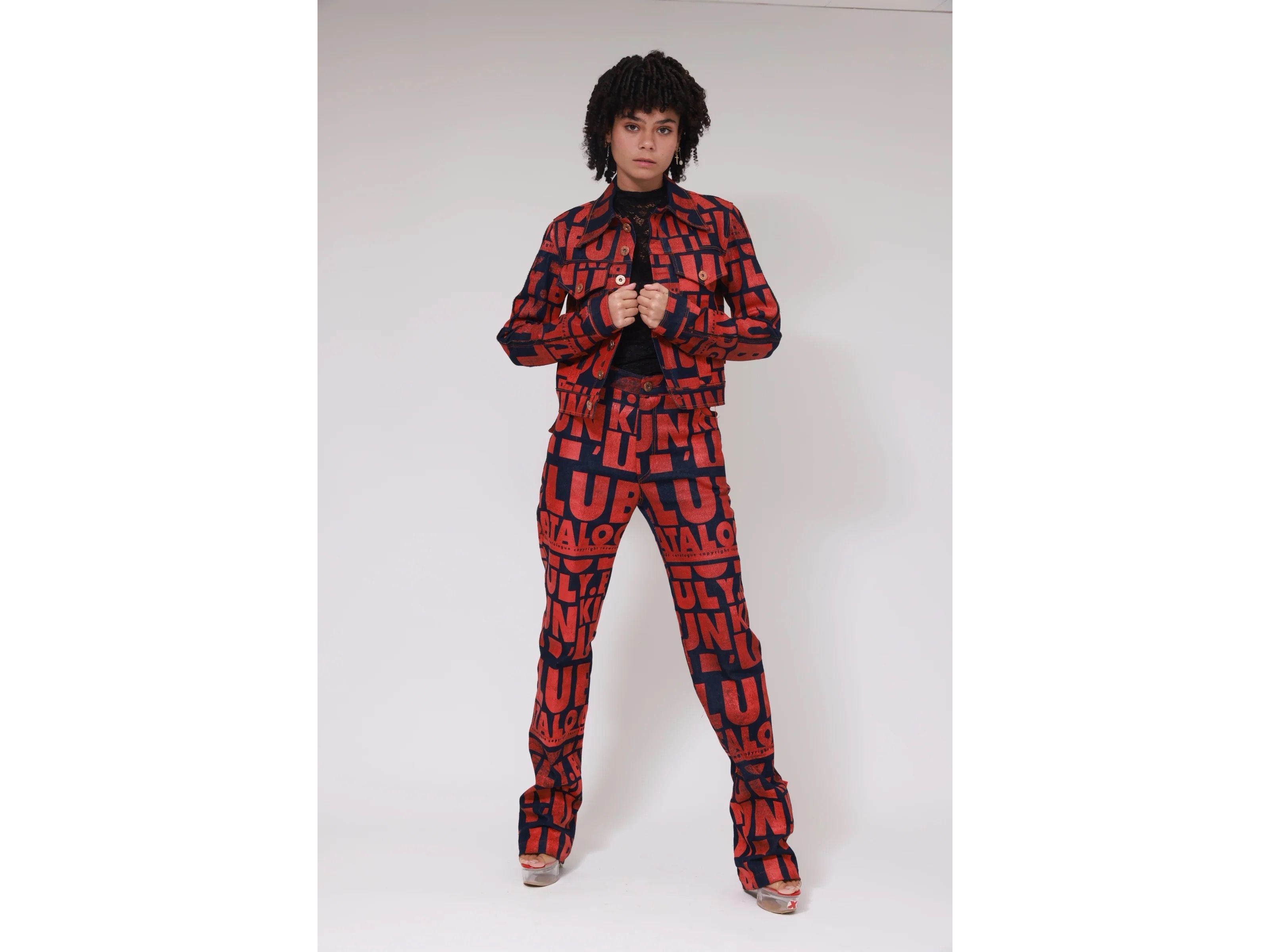 Alliez style et audace avec ce pantalon slim en denim imprimé drapeau XB. Sa coupe près du corps met en valeur votre silhouette, tandis que son design unique ajoute une touche moderne et originale à vos tenues. Parfait pour affirmer votre personnalité avec élégance et confort au quotidien.