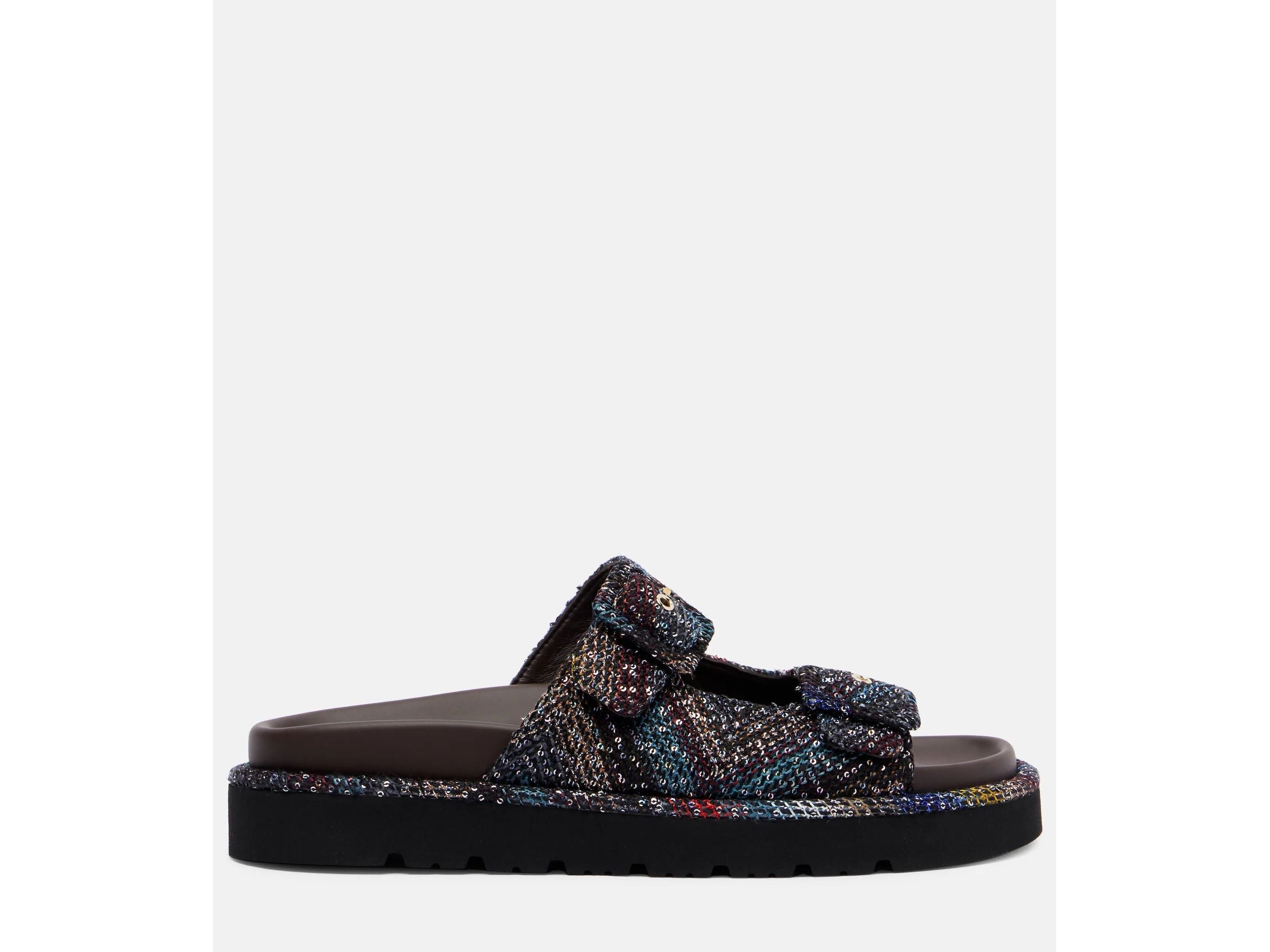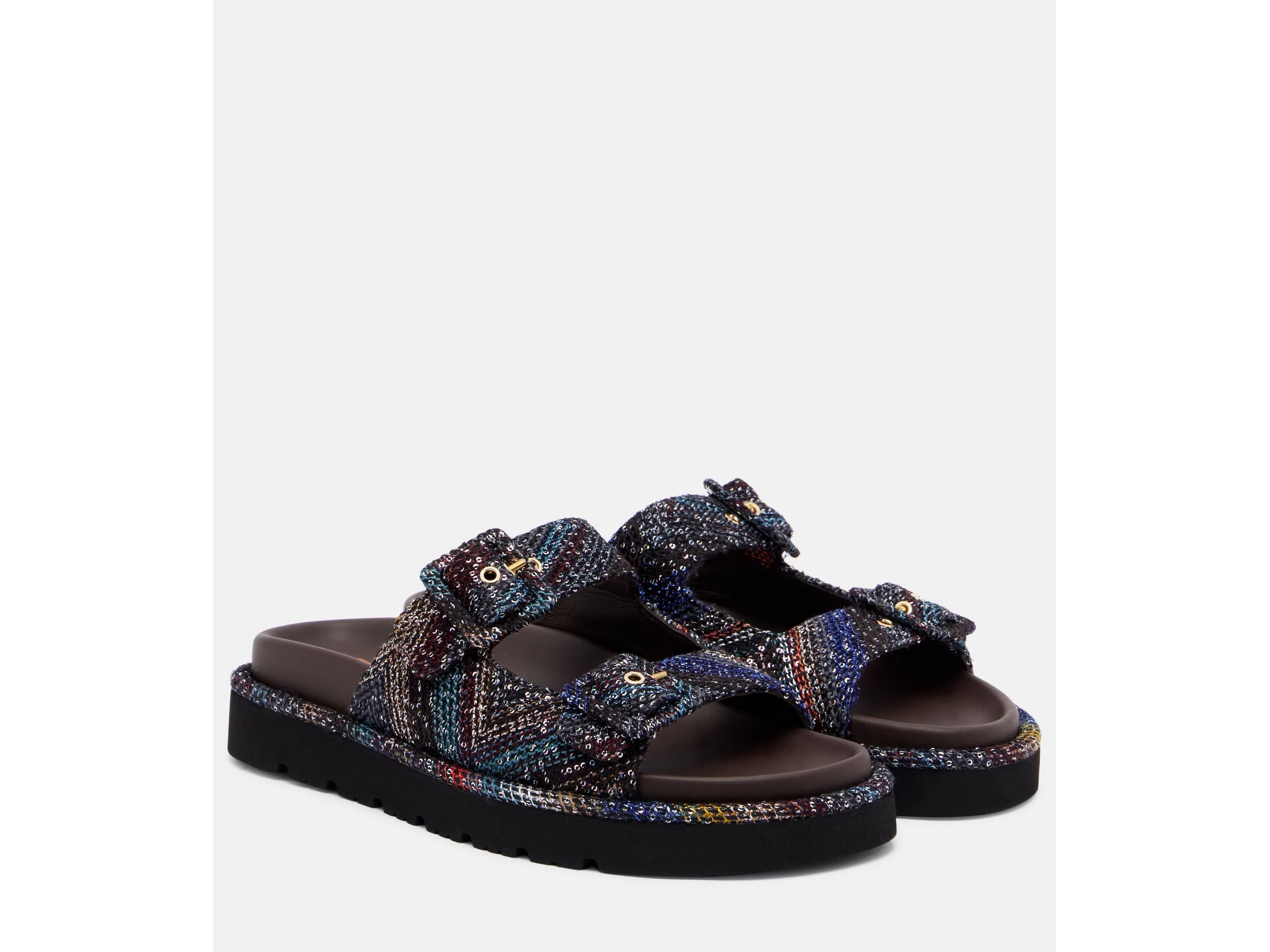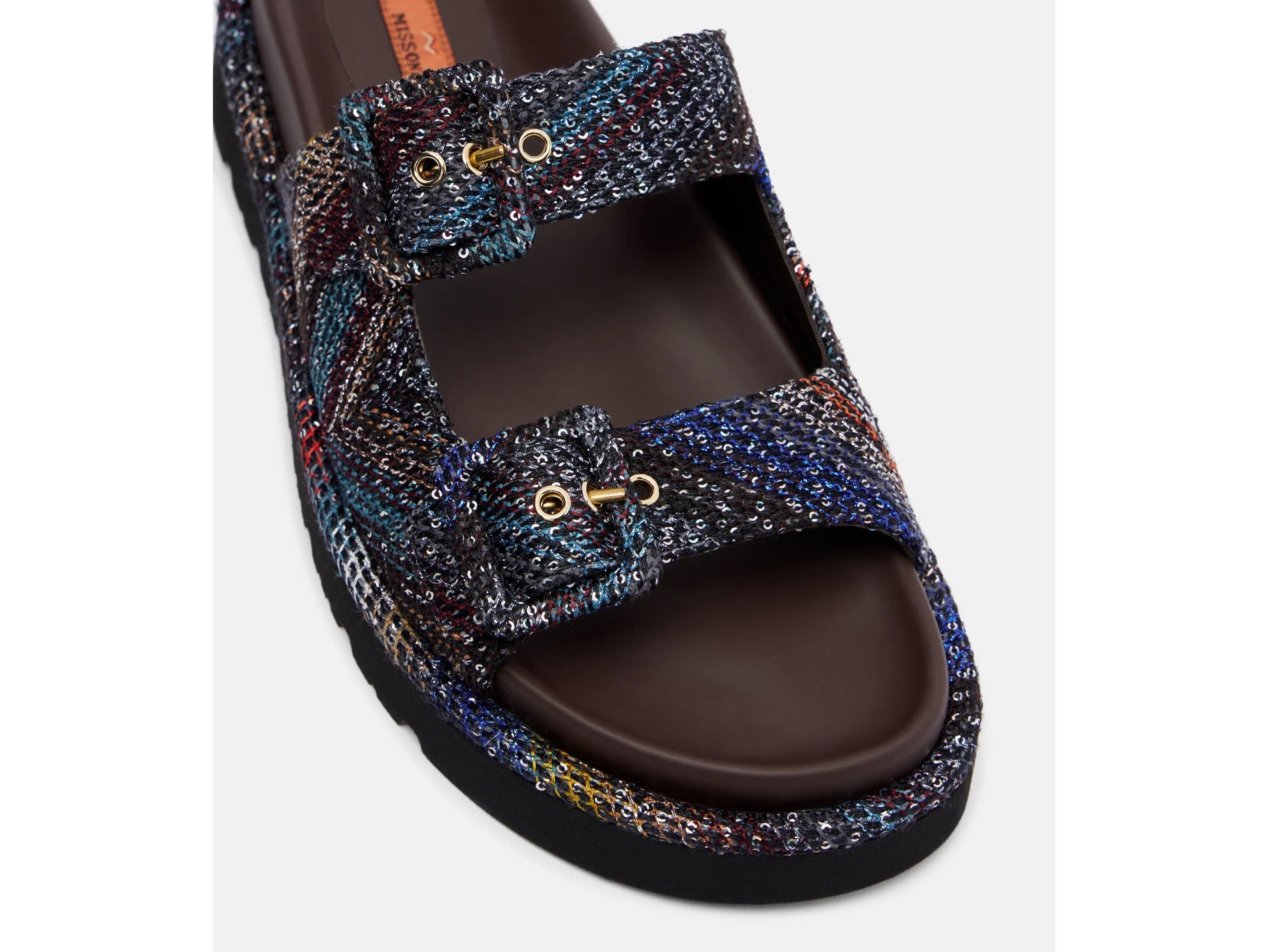 Sublimées par le tissu zigzag emblématique de Missoni et des sequins tissés, ces sandales en cuir allient élégance et confort. Leur fermeture à boucles réglables assure un ajustement parfait, tandis que la semelle intérieure profilée offre un maintien optimal. Fabriquées en Italie, elles se distinguent par leur bout rond ouvert et leurs détails métalliques dorés, pour une touche sophistiquée. Livrées avec une housse de protection, ces sandales multicolores sont un choix raffiné pour sublimer vos tenues estivales