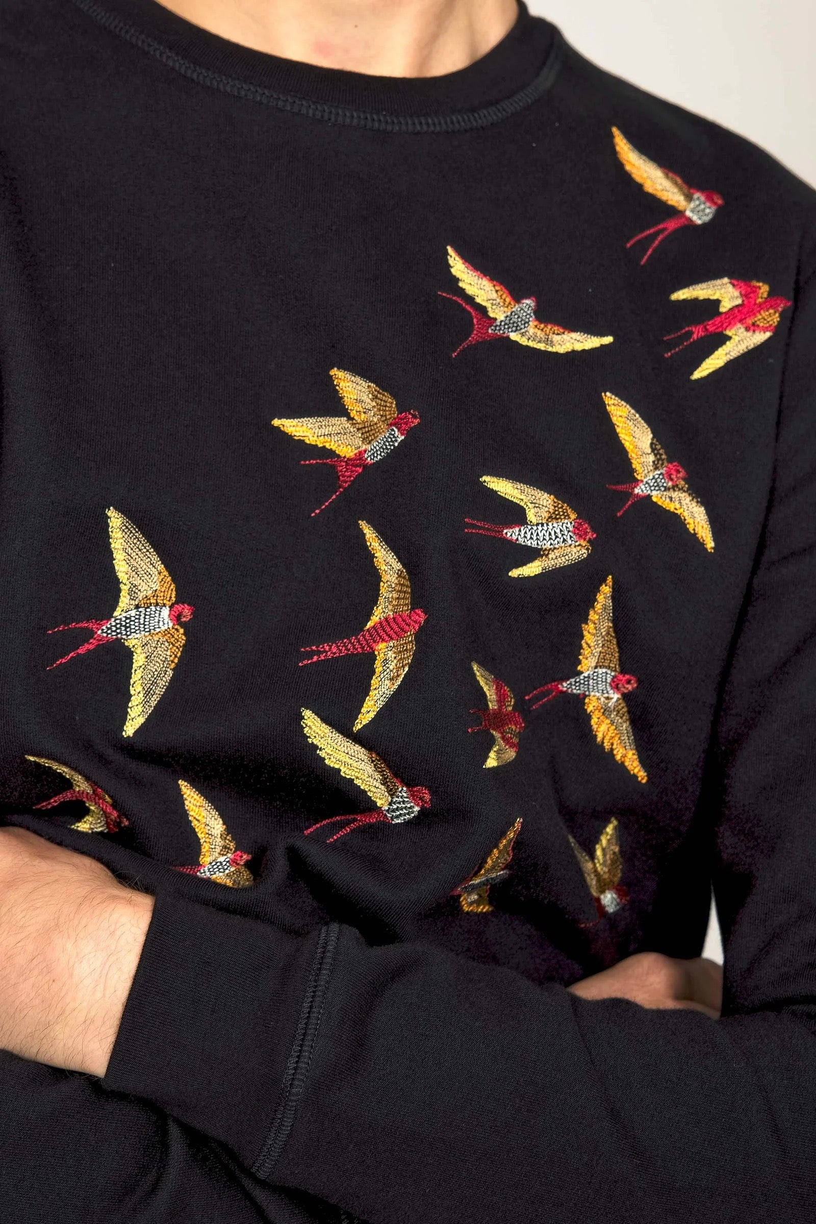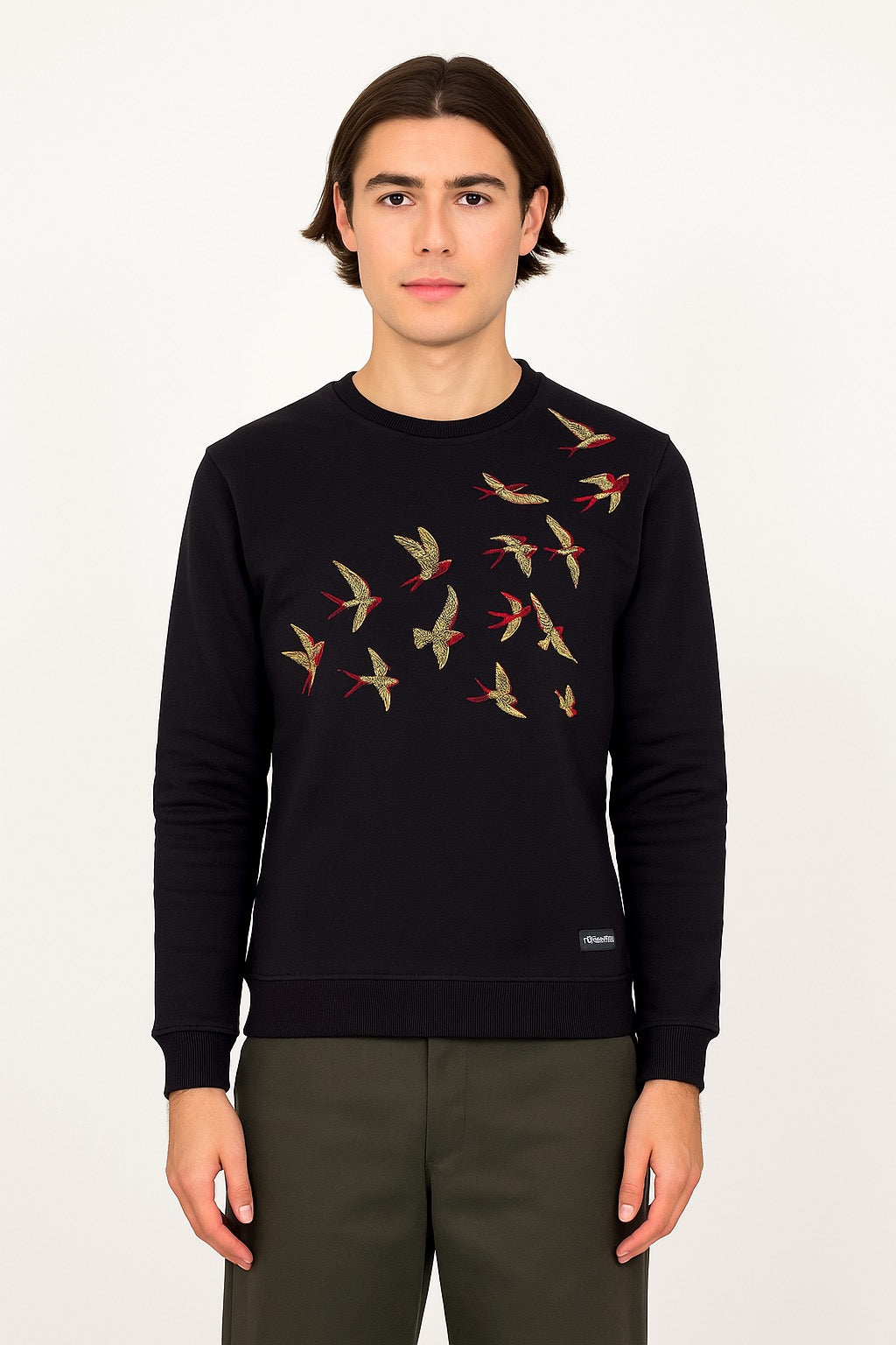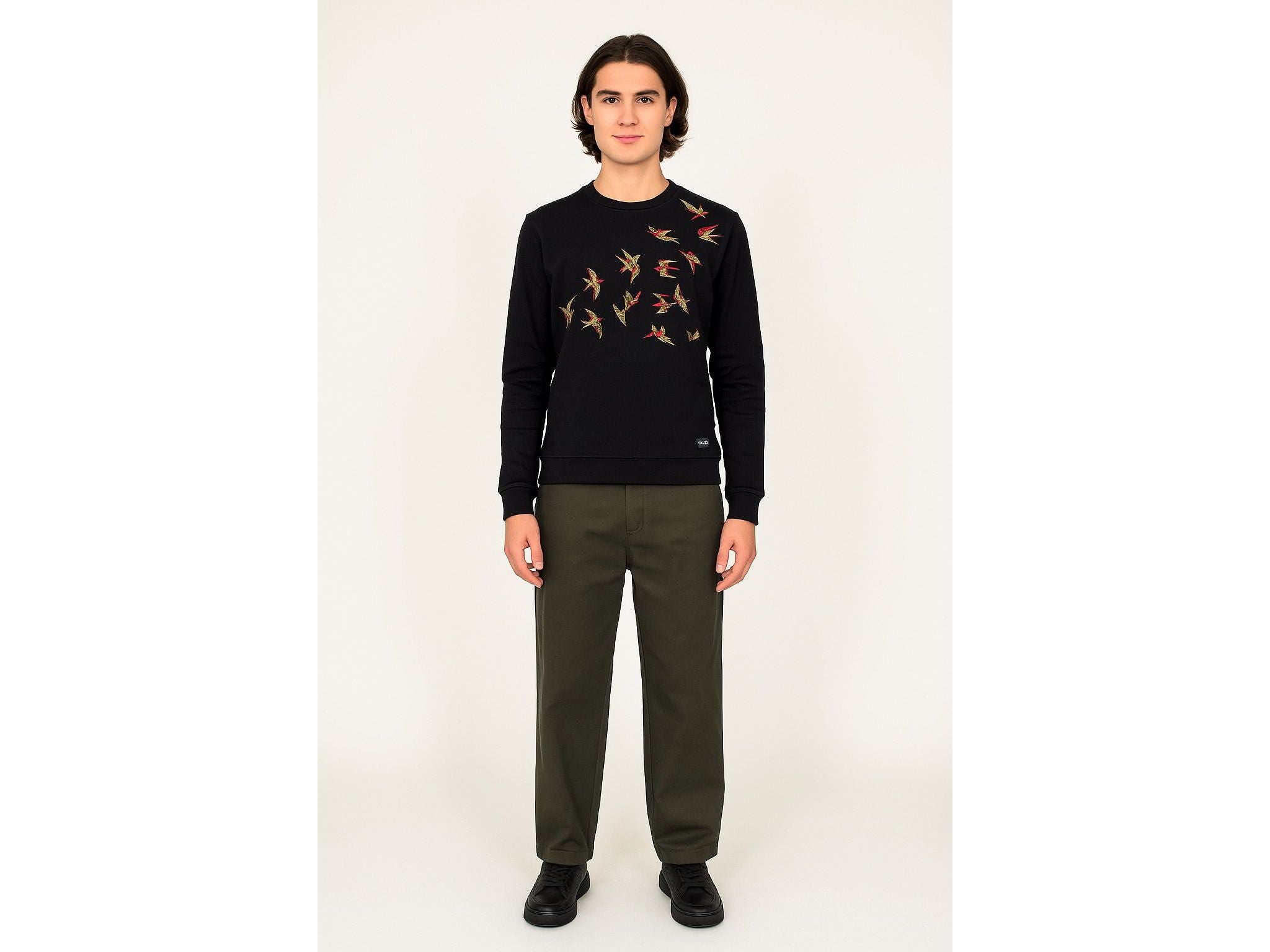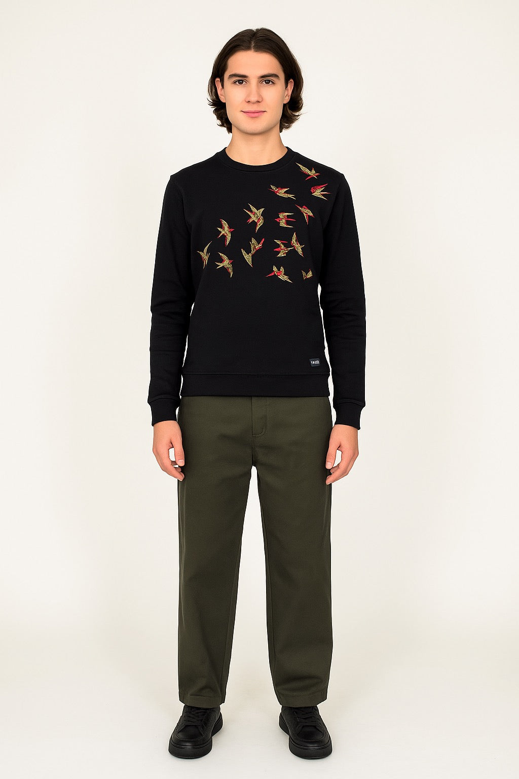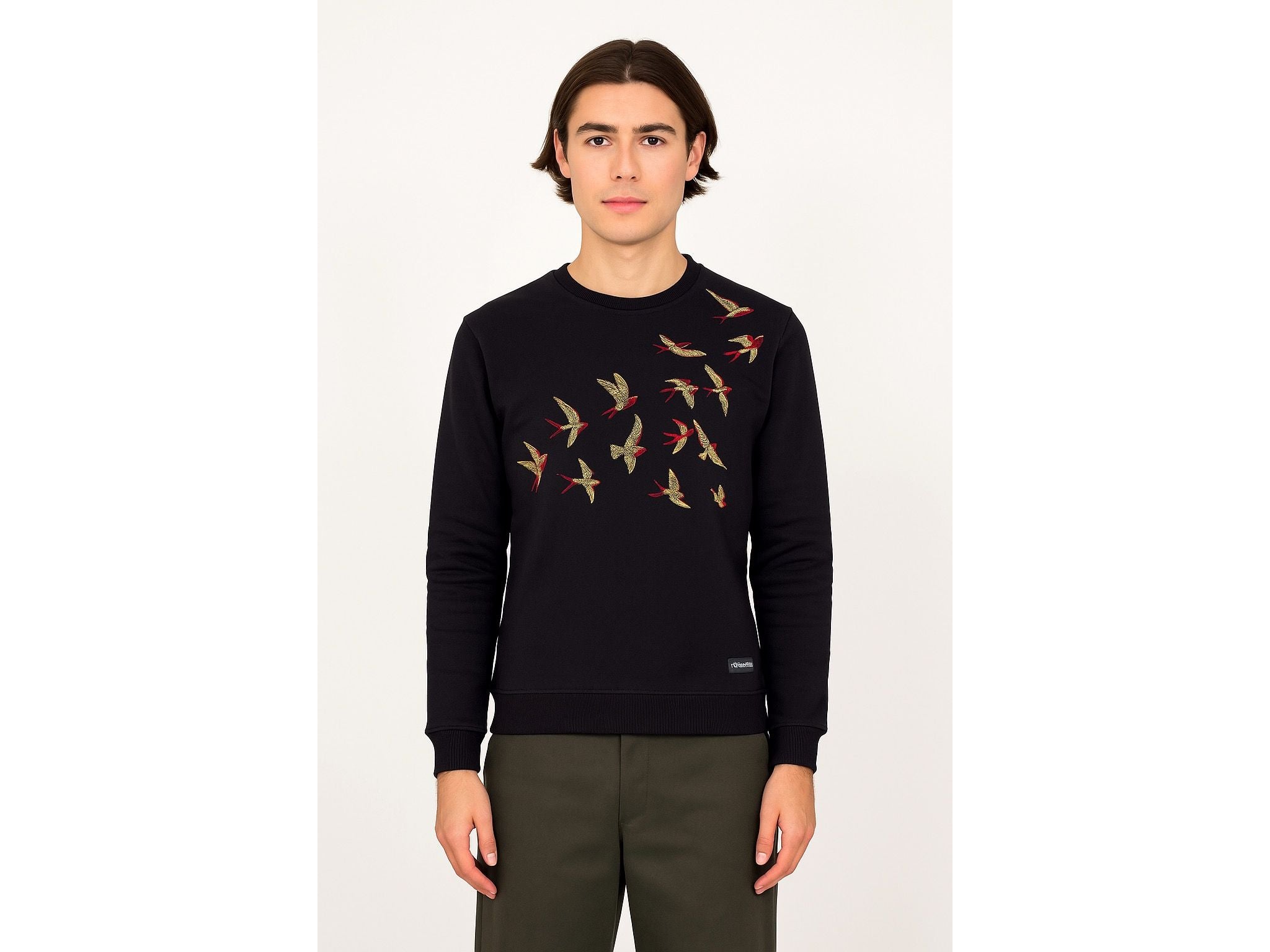 Sweatshirt en coton noir orné d'une broderie oiseaux délicate. Inspiré par la symbolique de la liberté et la beauté de la nature, ce sweat incarne l'engagement de notre atelier pour la qualité artisanale. Chaque broderie graphique raconte une histoire, transmettant nos émotions et convictions à travers un vêtement pensé pour durer. Confortable et intemporel, il devient bien plus qu'un basique : une déclaration de style conscient et authentique► Le mannequin porte la taille M et mesure 193cm